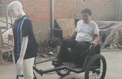 Выглядит робот в должности рикши, скажем прямо, необычно; скорость транспортного средства совсем невелика, что никак не мешает умельцу радоваться своему творению и наслаждаться поездками.