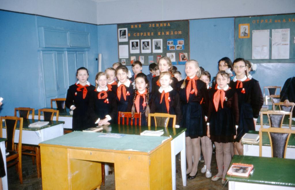 Или фото со школьницами-пионерками: (подсказываю, что можно отметить - обшарпанный стол учителя, убогая мебель, серые стены, более чем скромная одежда девочек, и т.д.).