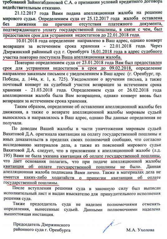 Сегодня, 28.06.2019 г я получила ответ-отписку от председателя Дзержинского районного суда, они своих не сдают, то есть ворон ворону глаз не клюнет. Председатель суда Ухолова считает, что я сама виновата в том, что в приложение не приложила госпошлину, ходатайство не предоставила с госпошлиной, странно, она что не видит, что госпошлина указано в шапке апелляционной жалобы, кроме этого мировой судья Вахитова Д.А. мне бы позвонила, если бы отсутствовала госпошлина, но она мне не звонила, следовательно, судья Вахитова Д.А. сама куда то дела. Что интересно, Ухолова пишет, якобы я 16 января 2018 г еще раз зарегистрировала Апелляционную жалобу, поэтому Вахитова 23.01.2018 г вынесла Определение - это полный бред с ее стороны, я зарегистрировала Апелляционную жалобу в Дзержинском районном суде 22.12.2017 г, а не 16.01.2018 г