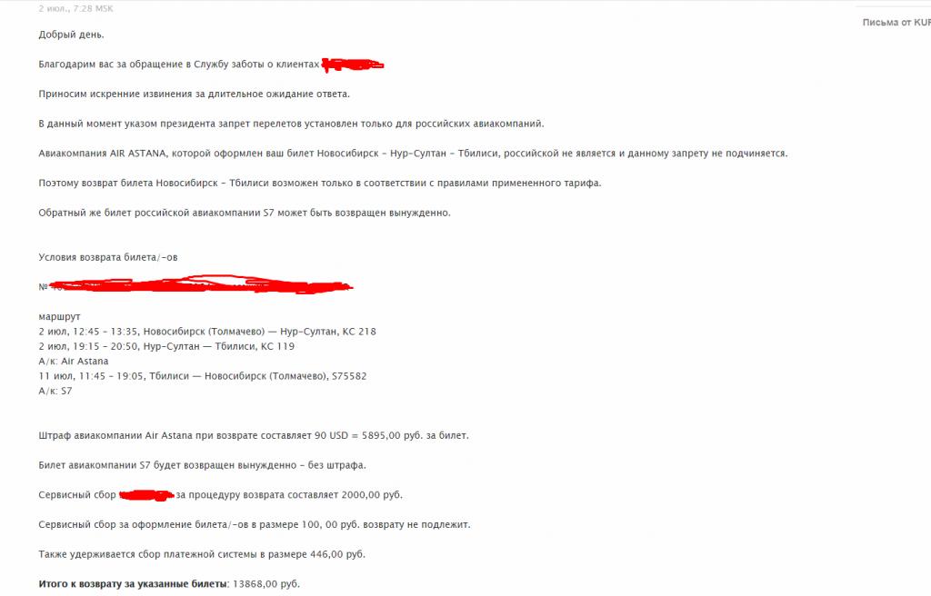 Пришел мне такой ответ по заявке на возврат билетов в Грузию и из нее.