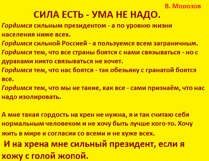 И что интересно - многие из тех, кто презирает 2-ой тип людей, гордятся страной, которая ни фига не может и не производит, но лезет ко всем со своими советами. Да ещё ставят это в заслугу, типа - мы сильные, потому что заставили всех уважать нас. Учится ни у кого не будем, потому что мы лучше всех. А если живём хуже, так это потому, что мы всё можем выдержать и скрепы у нас такие - а если захотим, то вообще весь мир нагнём.