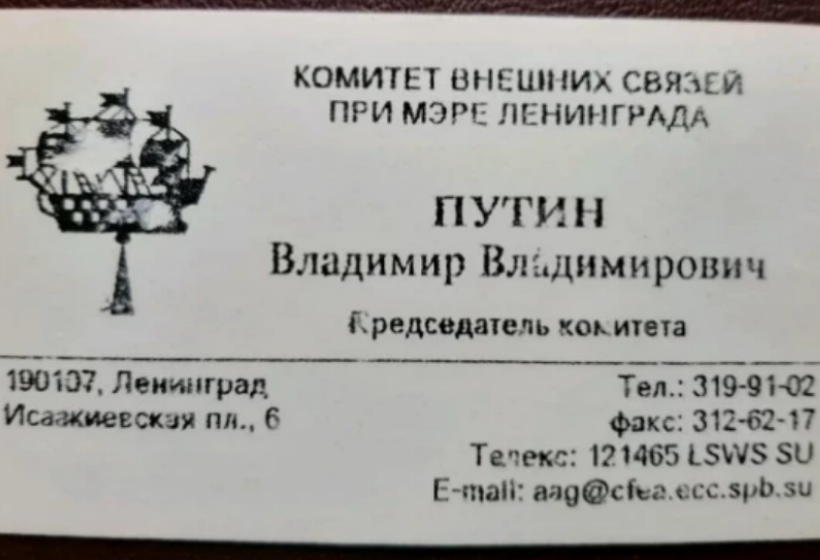 Странная визитка. Комитет внешних связей при мэре Ленинграда, а в адресе эл. почты.spb. Если предположить, что визитку разработали после переименования (16.05.1992), то почему не убрали Ленинград...