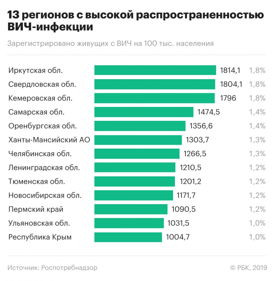 Более того, в 35 регионах России ВИЧ заражены более 0,5% населения.