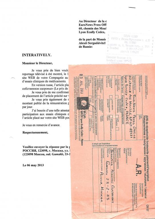 Это Официальный запрос на Европейский ТЕЛЕКАНАЛ ЕВРОНЬЮС вещающий в РОССИИ. После его получения, ОФИС ТЕЛЕКАНАЛА во ФРАНЦИИ, ПОМЕНЯЛ СВОЁ МЕСТОНАХОЖДЕНИЕ.