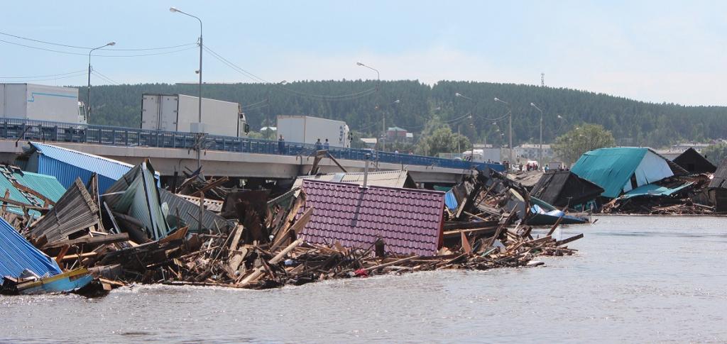 Последствия стихии видны повсюду: на дорогах, тротуарах валяются доски, шифер, вещи. Кое-где на сухих местах стоят палатки, греются котелки на маленьких кострах — люди ночуют прямо здесь, стерегут вещи от мародеров. Федеральная трасса, которая проходит через город, теперь выглядит как мост – по обеим сторонам вода, в которой плавают дома, заборы, машины и даже тяжелая техника.