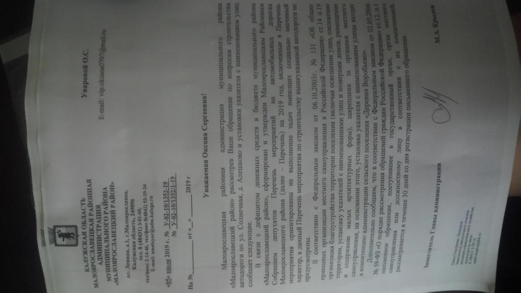 Добрый день. Уважаемые юристы и адвокаты. Ситуация следующая и хотелось бы как то её решить. Мы купили с мамой (пенсианеркой) участок в калужской области статус ЛПХ. Но дело в том что там нет дороги это все находится на второй линии улицы в деревне. Там чистое поле съезда нормального нет, если дождь или снег, то жители полностью заблокированы. Если пешком по полю идти к трассе, то минут 40 по полю, трава вообще не косится по 1,5 метра, косим только возле двора. Участки проданы не все пока, по улице 3 дома. В письме я указывал, что нет даже сквозного пролёта вдоль улицы, а это километра полтора. Мне пришёл вот такой ответ.