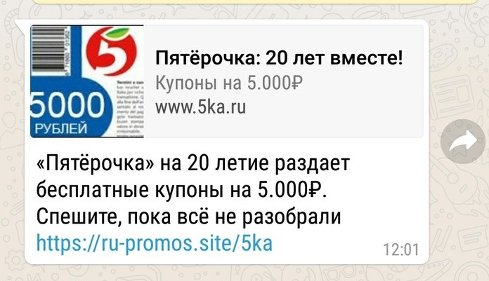 В данной публикации мы поговорим о рассылке сообщений якобы от имени магазинов «Пятерочка», в которых получателям сообщается о том, что сеть готова подарить им купон на 5 000 рублей за прохождение нехитрого опроса про отношение к ней. Мы выясним, имеет ли к этому какое-то отношение сама «Пятерочка», и что может случиться, если гражданин решит воспользоваться этим щедрым предложением.