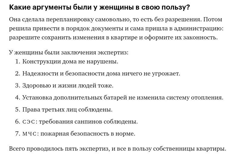 Эксперты из разных ведомств подтвердили и в один голос говорят, что нарушений не видят и все требования соблюдаются. Фактически перепланировка в квартире сделана по закону и никому не мешает. Нет причин запрещать женщине все узаконить. Итог: