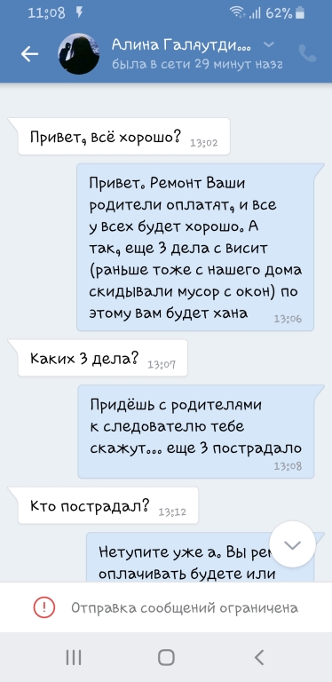 Сегодня пришёл муж с участка сказал что родители этих детей будут писать на меня заявление об угрозе. Но в переписке угрозы жизни нет. Девочка сама мне написала, на что я ей ответила. В скрине указано.