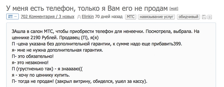 Поэтому сотрудники магазинов сотовой связи идут на всякие ухищрения, чтобы «вытянуть» с покупателя как можно больше денег за ненужный ему товар. И, как мы видим по вышеописанной ситуации, нормами морали и этики продавцы зачастую не гнушаются.