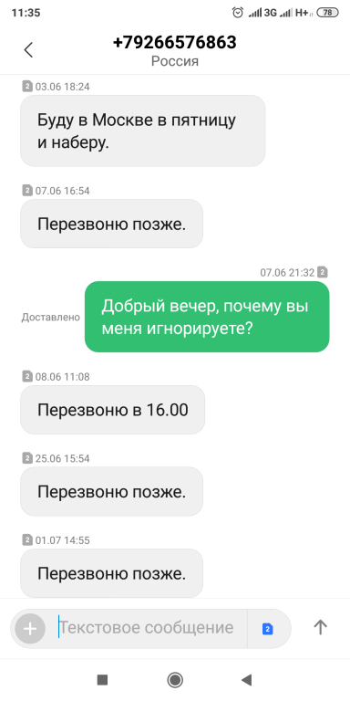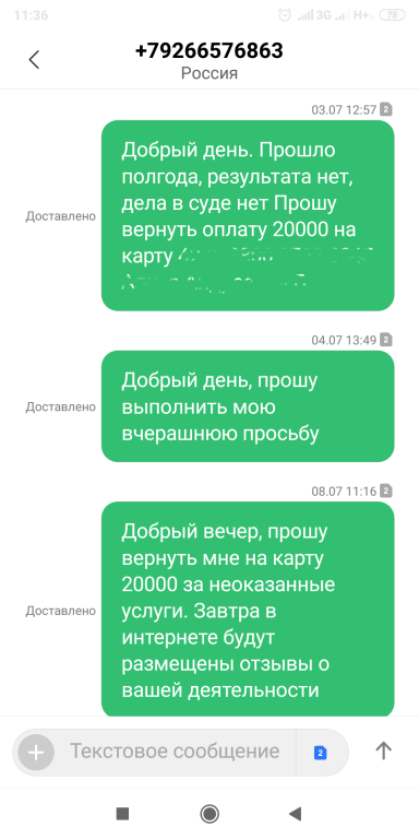Далее телефонного общения с этим "юристом" у меня не было, на мои звонки он не отвечал. В лучшем случае могла прийти смс с обещанием перезвонить.