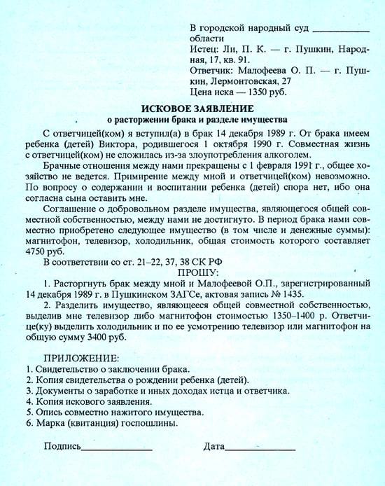 Образец искового заявления