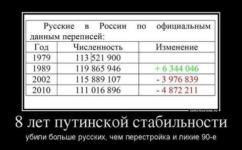 Замечательная наука - логика! Как только Ленин установил СОЦИАЛИЗМ в России, так сразу ВВП с 4 места в Европе вышел на первое. И самое главное - коренное население страны получило взрывной рост, несмотря на росказни про ленинские-сталинские репрессии. Что доказывает резкое улучшение благосостояние населения. А как только елцин вернул капитализм, а путин стал гарантом буржуазной конституции, так сразу пошел обвал численности населения, несмотря на массовый ввоз мигрантов для замены русских. Наверно, дохнут русские люди от счастья! Поверяем логику по данным переписей русского населения: