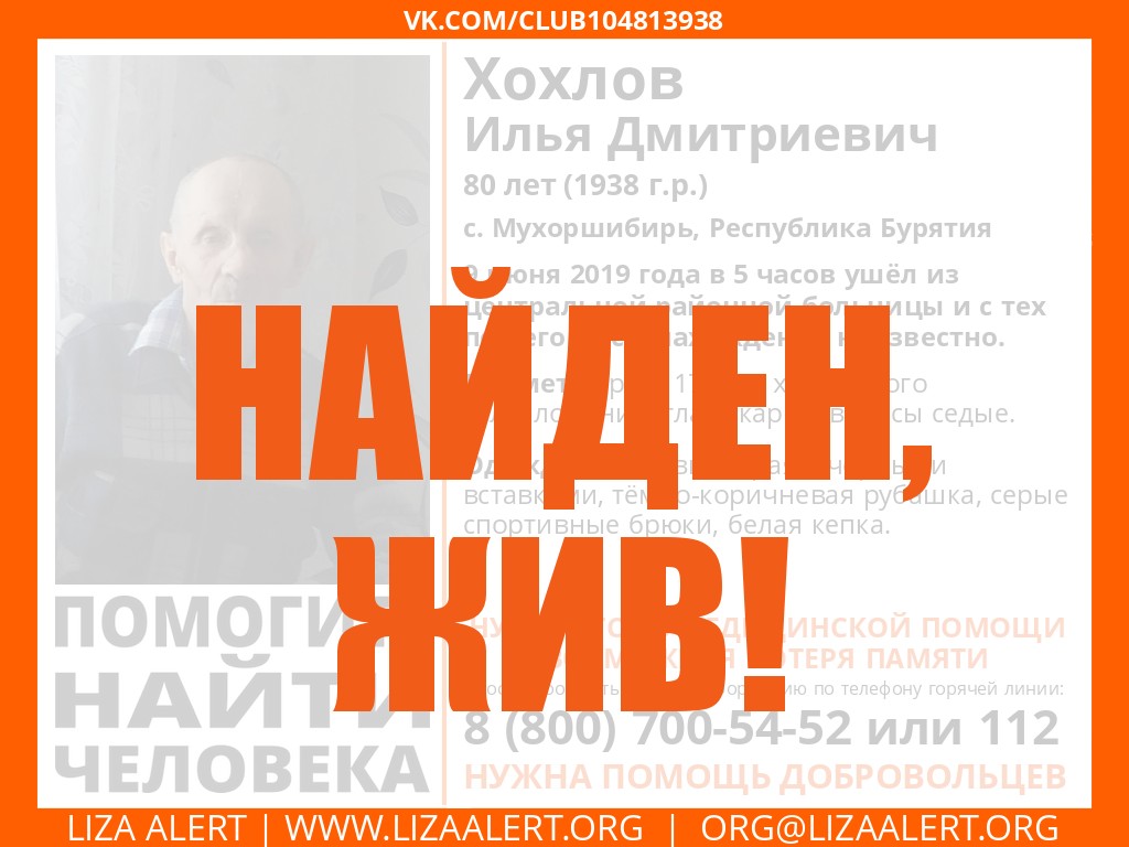 Хохлов Илья Дмитриевич, 80 лет, Мухоршибирский район, с. Мухоршибирь. 9 июня 2019 года около 05.00 ушёл из центральной районной больницы в неизвестном направлении.