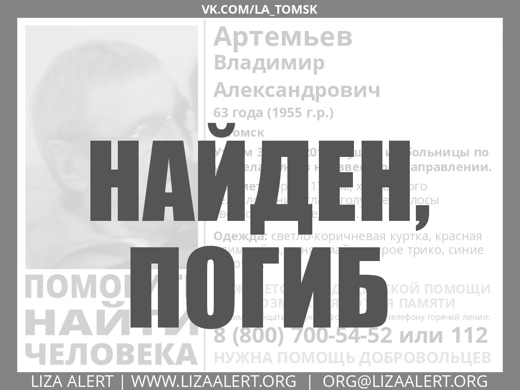 Артемьев Владимир Александрович, 63 года, Томск. Утром 30 мая 2019 года ушёл из больницы по ул. Бела Куна в неизвестном направлении.
