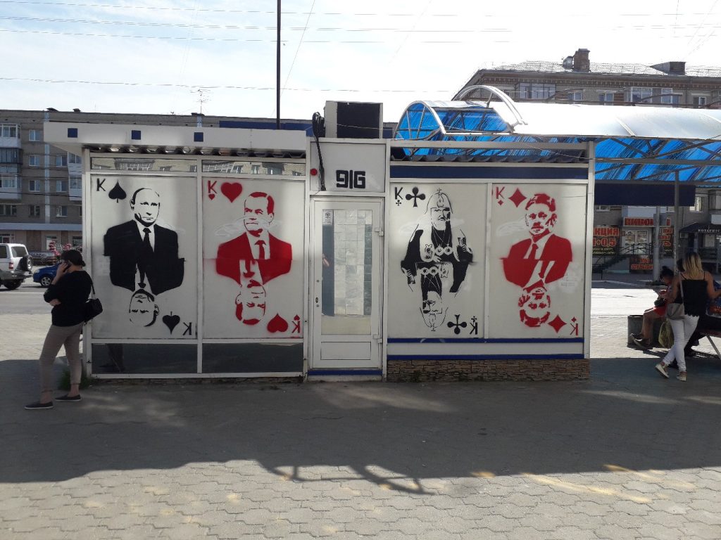 В городе Каменске-Уральском Свердловской области на остановке проспект Победы нарисовали граффити игральных карт с портретами людей похожих на президента Владимира Путина, его пресс-секретаря Дмитрия Пескова, премьера Дмитрия Медведева и патриарха Кирилла. Изображения стилизованы под четырех королей из колоды игральных карт-достоинства и масти карт вполне узнаваемы. Сейчас новость об этой акции активно обсуждается в городской публике. Отношения к ней высказываются разные. Имя автора не раскрывается. Но жители утверждают. Что раньше уличный художник не затрагивал политику.