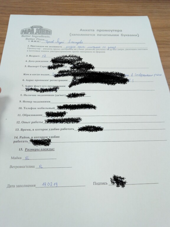 Устроился работать промоутером. Раздача листовок. Попросили паспорт. Сделали ксерокопию, заполнил анкету свои данные. Офис пиццерии "Папа Джонс". Сейчас страшно, может ли что нибудь произойти?