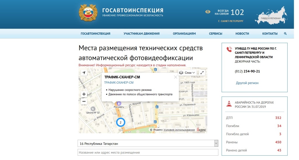 В рамках выполнение поручений Президента РФ, ГИБДД России запустила новый сервис с картой дорожных камер на своем сайте. Адрес сервиса в сети Интернет. На данный момент сервис находится на стадии наполнения и возможно не отражает всей информации о дорожных камерах. На карте отображается список камер с их адресами и расположением. Каждой камере дается описание, в том числе указываются виды фиксируемых нарушений ПДД.