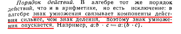 В алгебре знак умножения связывает компоненты действия сильнее, чем знак деления, поэтому знак умножения опускается.
