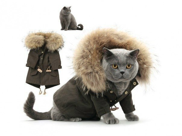 У меня у кошки британки было пальто с капюшоном и брошкой, только вязаное. Я водила ее в нем гулять, когда прохладно в межсезонье.