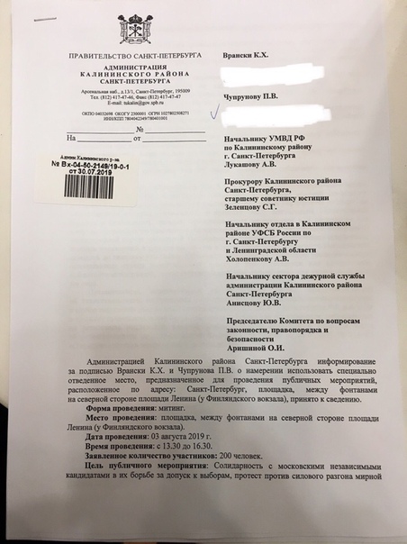 Прокуратура Петербурга опубликовала на официальном сайте предостережение об ответственности за участие в «несогласованном массовом публичном мероприятии» на территории Калининского района 3 августа.