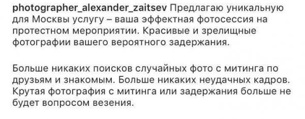 Принять участие в митинге протеста, для многих диванных "экспертов" , особенно молодого возраста, является целым событием, яркой вспышкой в их серой, наполненной интернет баталиями жизни. А чтобы было о чем рассказать внукам о тяжелой жизни "борца за справедливость", в Москве появилась новейшая, уникальная услуга - "эффективная фотосессия на протестном мероприятии. Красивые и зрелищные фотографии вашего вероятного задержания".