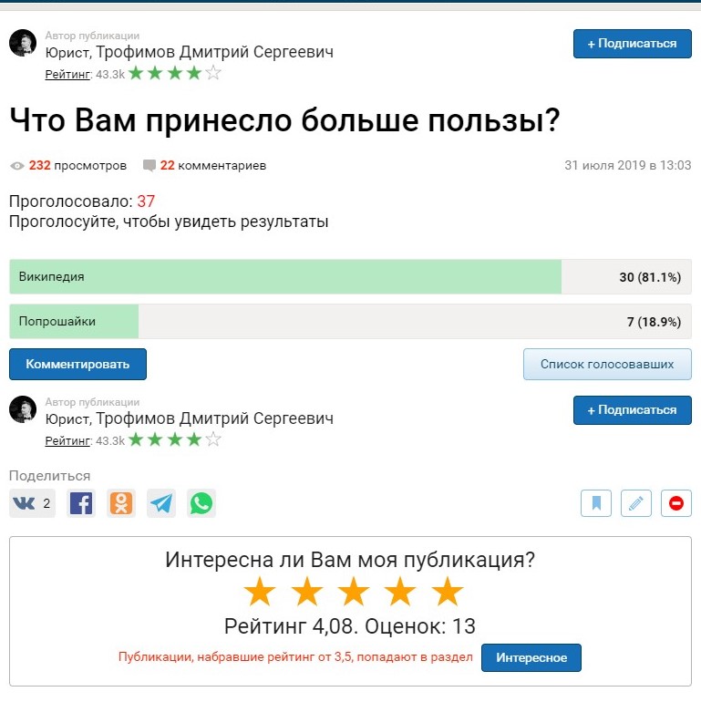 И вот подводим итоги по третьему вопросу. По итоговому вопросу Что Вам принесло больше пользы? получились такие результаты: 81,1% (30 голосов) ответили «Википедия» против 18,9% (7 голосов), ответивших «Попрошайки».