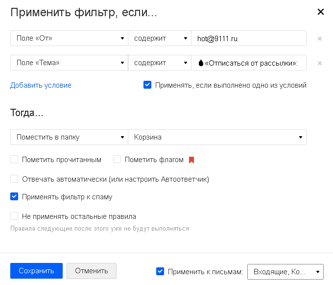 Можно и просто в СПАМ и такие письма будут автоматом потом туда идти.