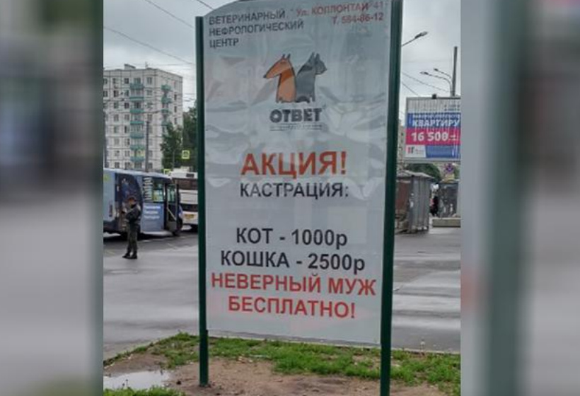 Как следует из материалов дела, недалеко от станции метро «Дыбенко» был размещен баннер с информацией о кастрации кошек и собак. Реклама также гласила о бесплатной кастрации неверных мужей. В ведомство было подано пять жалоб на данную рекламу.