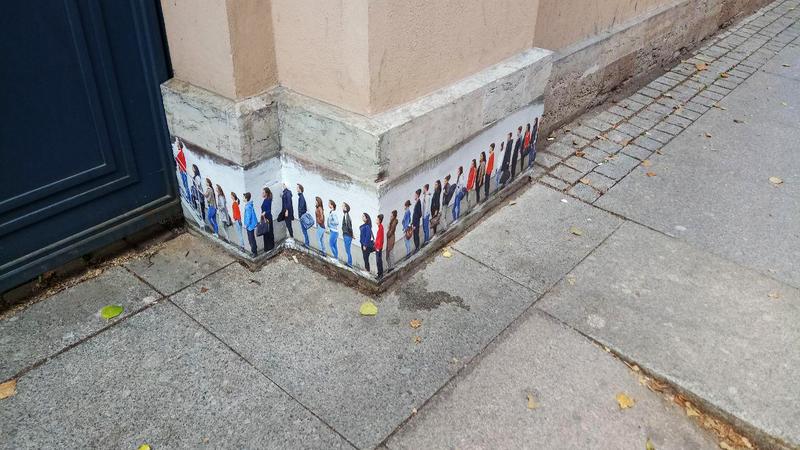 Рисунок представляет собой изображение людей, чуть более двух десятков, на небольшом пространстве колонны входной группы в консульство, в самом её низу.