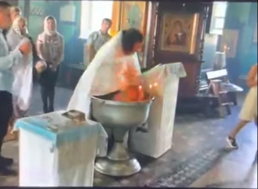 На кадрах видно, как священник применив силу, то есть насильно окунает в воду кричащего ребенка.