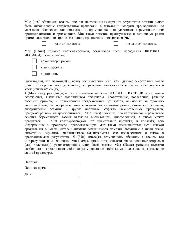 Повторное заявление истца в октябре 2016 года на проведение медицинского вмешательства иным более технологичным способом подтверждает то, что данное медицинское вмешательство не охватывается рамками базового этапа проведения ЭКО, а является отдельным дополнительным медицинским вмешательством, которое осуществлялось по единоличному волеизъявлению истца на основе только ее единоличного информированного добровольного согласия.
