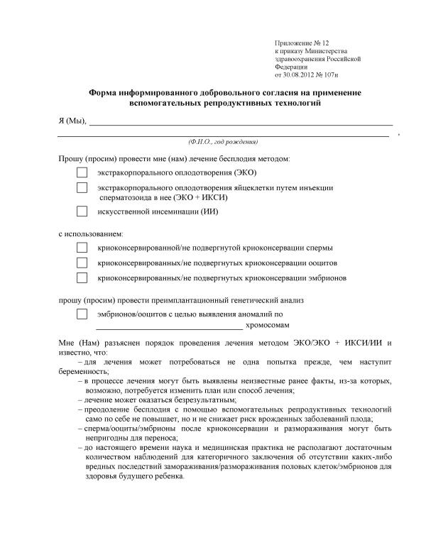 Форма заявления, установленная Приложением № 12 к Порядку использования вспомогательных репродуктивных технологий, противопоказаний и ограничений к их применению, утвержденных приказом Минздрава России от 30 августа 2012 г. № 107 н (Подробнее ➤), не содержит указаний на необходимость обозначения правовых статусов заявителей (муж/жена), в связи с чем подписанное сторонами в январе 2016 года заявление не соответствует установленной форме и на этом основании не может рассматриваться как основание для возникновения прав и обязанностей для лиц, не состоящих в зарегистрированном браке.