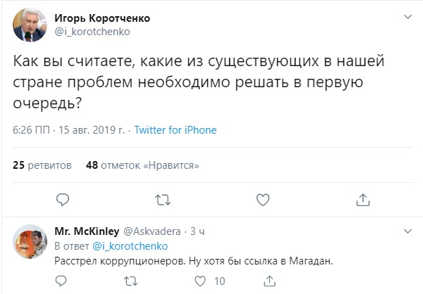 Игорь Коротченко запустил свой опрос на своем аккаунте в Твиттере. Заданный им вопрос звучал так: