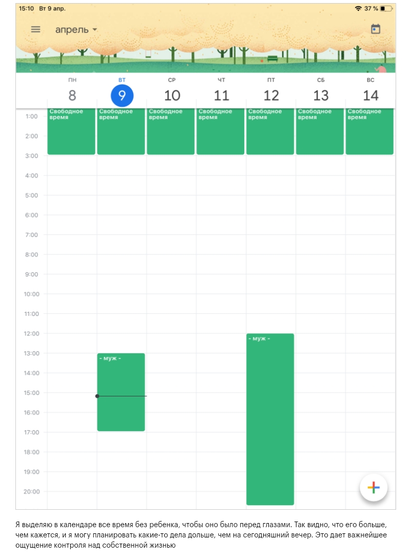 Когда сын рядом, все внимание автоматически переключается на него. А для работы и отдыха нужно время, когда мое внимание будет под моим контролем. Чтобы это организовать, я отмечаю свободное время в календаре отдельным цветом.
