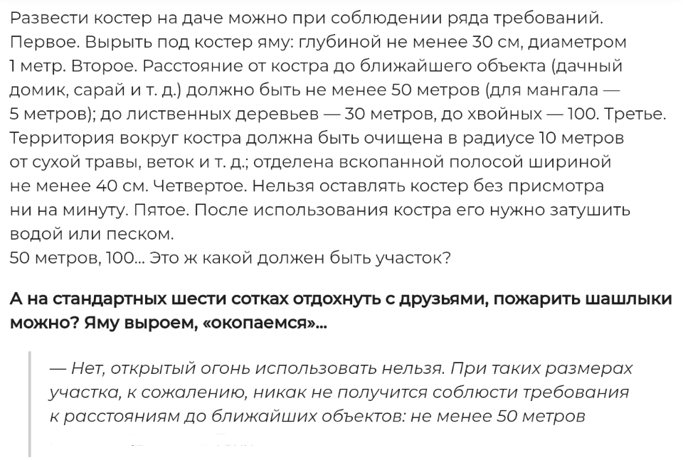 Вот и получается, что учитывая минимальные расстояния (50 метров до каких-либо построек, своих или соседских) - нужен участок 100 х 100 метров, с кострищем в центре. Ни о каких 6 сотках тут, естественно, речи не идёт...