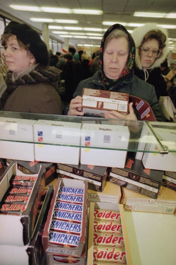 Тут стояла очередь. Зато чуть позже кроме этих марсов/твиксов/сникерсов/баунти в магазинах ничего не было. И, странное дело, мало кто их покупал.