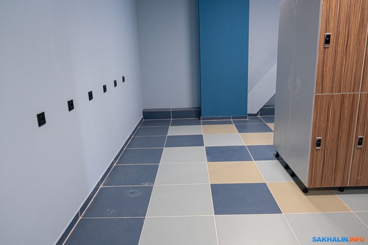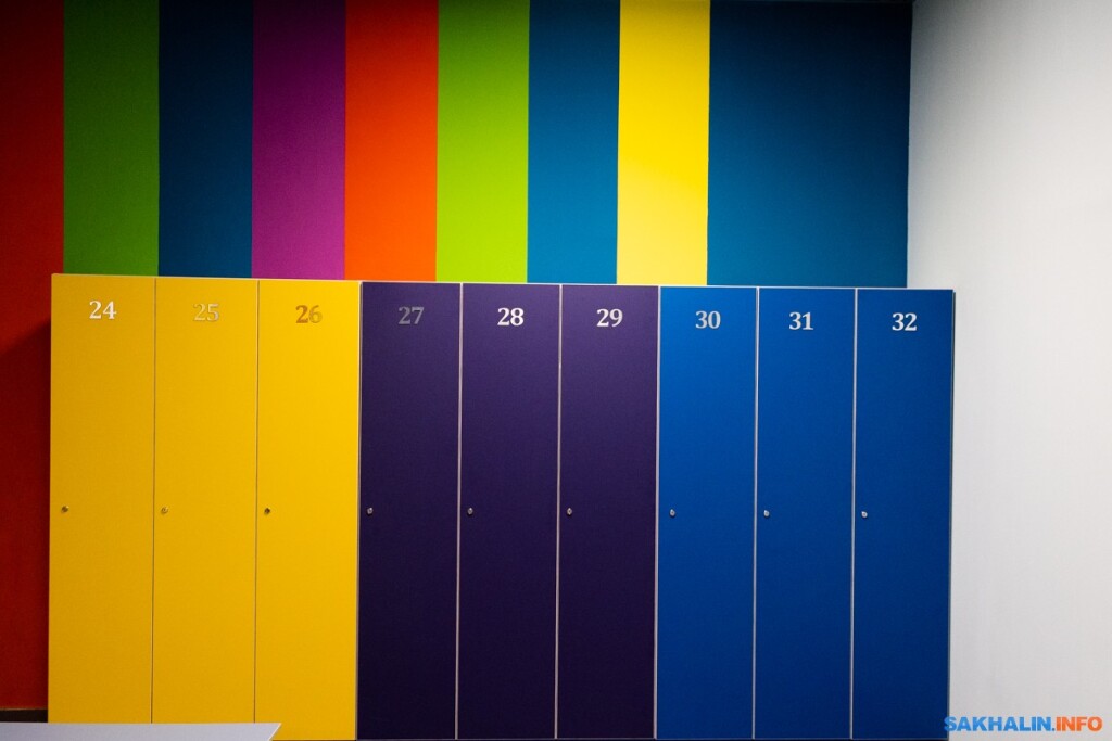 Принцип перемещения: в фойе через входные двери, к кассе, в гардероб, через турникеты в раздевалку. Раздевалка общая, в ней закрытые шкафчики для смены одежды на купальники и плавки, затем шкафчики, куда все можно сложить, а потом два выхода в душ — мужской и женский. Правда, если кто-то открыл дверь, чтобы туда попасть, все остальные могут видеть раздетых людей. При этом взрослые и дети находятся вместе.