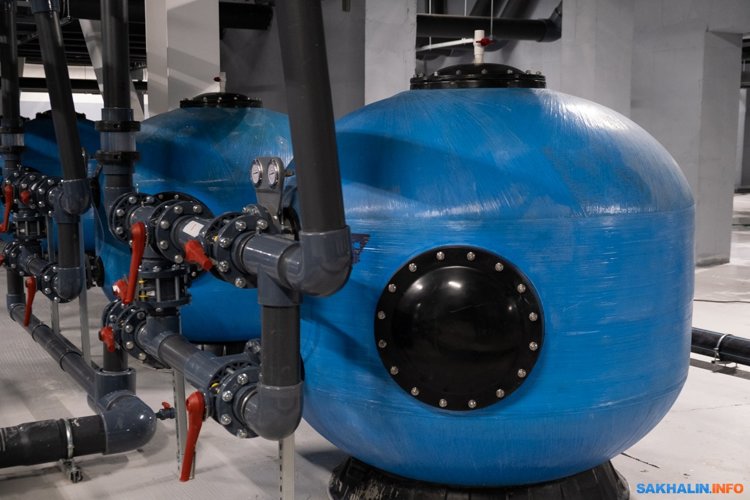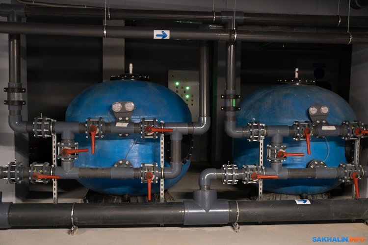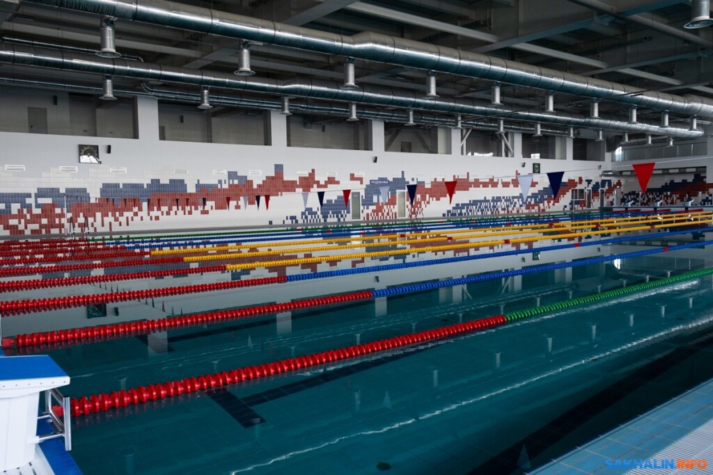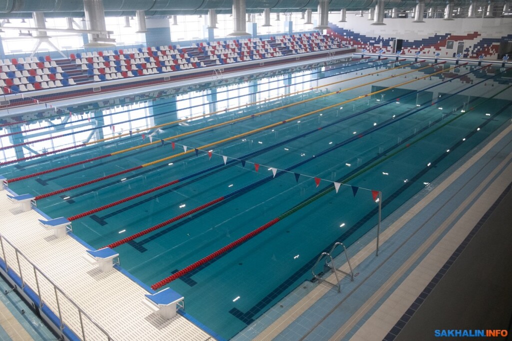 Спортивная зона с двумя бассейнами по 25 и 50 метров рассчитана на 500 человек (только зрителей, размещаемых на трибунах, а еще есть спортсмены и любители). Чтобы заполнить 50-ку водой, нужно три недели. Столько же примерно необходимо, чтобы наполнить аквапарк. Водная гладь сахалинского комплекса — это 7 миллионов литров воды, больше в России нет. Вода поступает из двух автономных скважин, есть еще две перспективные.