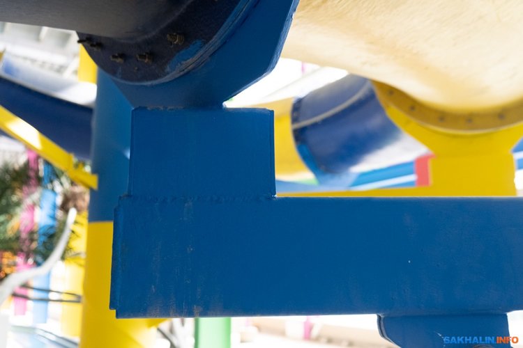 Эта красная горка, выкат с которой вы видели на первом фото. По всей видимости, какой-то ребенок в аквапарке уже был, иначе откуда бы появились черные каляки-маляки. Но обратить свое внимание нужно не на них, а на желтую металлическую балку, которая видна с нескольких ракурсов. В общем: вы катитесь с этой горки и вдруг, не приведи, конечно, бог, подняли руку или (ни в коем случае!) голову. Эта балка окажется ровно на уровне вашего носа. Или глаз, или лба — у кого какой рост. Потому что она торчит прямо над вами, когда вы ничего не подозреваете.