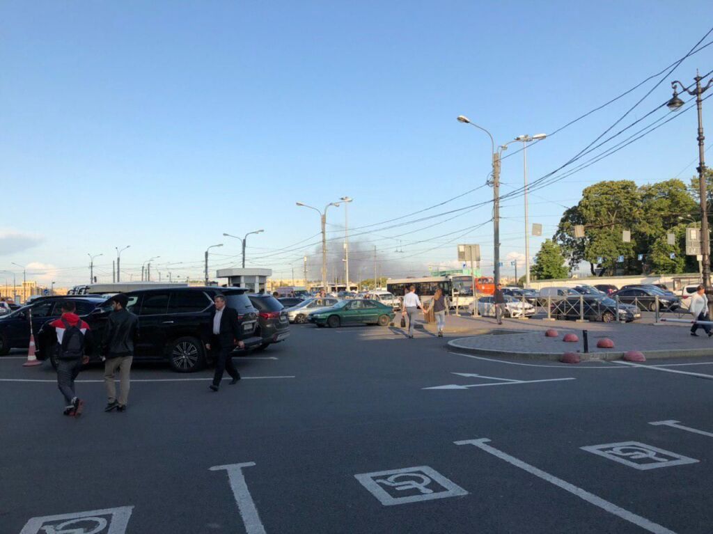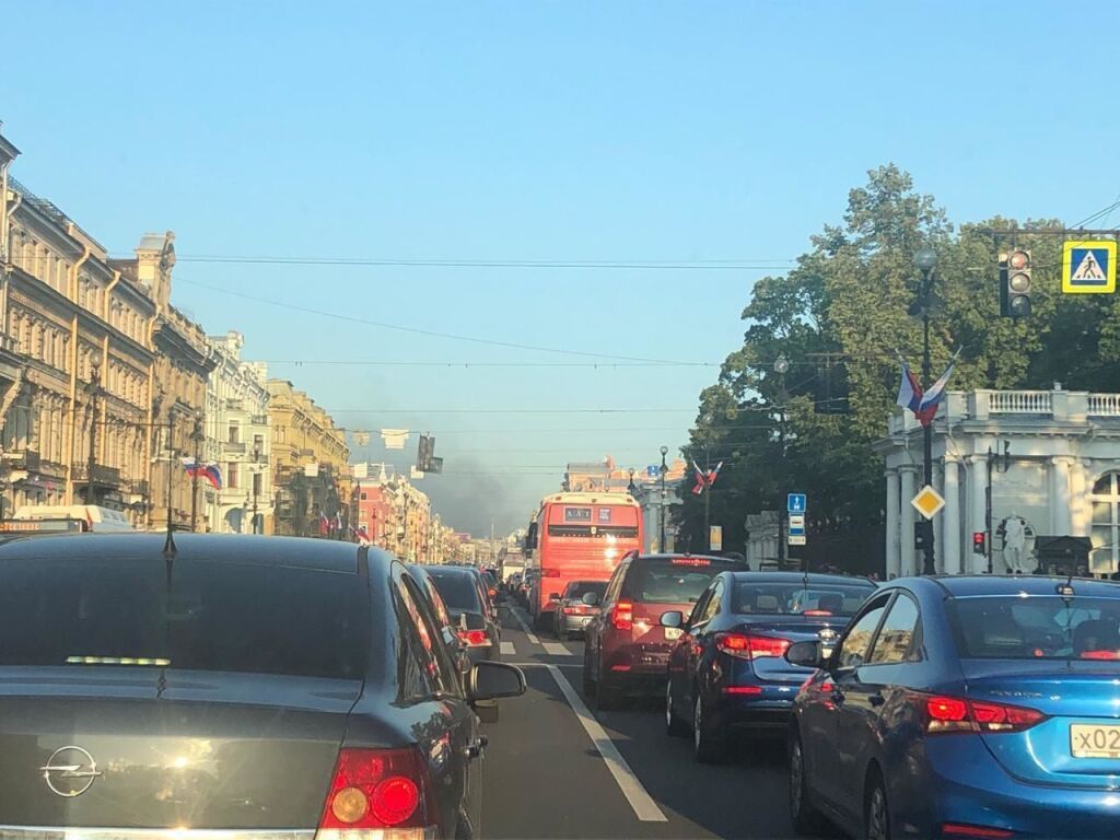 Дымовую завесу от пожара на Складской видно даже на Невском проспекте. Также клубы черного дыма видны за мостом Александра Невского.