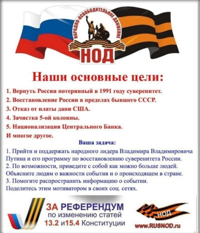 Я честно не разобралась ещё , но одно точно уловила, смена власти не особо меняет что то. А НОД предлагает изменить в конституции 13 статью пункт 2 и т.д. я в глаза не видела конституцию в принципе видимо пора ознакомится. Но НОД говорит так, америка в 96 году нам навязала свою конституцию и мы по статье 13 и т д обязаны дань америке платить и россию ограничевают в организации своего производства и т.д. суть не юридической партии создать референдум и они уже с 2012 года собирают подписи за то чтоб изменить этот пункт от которой есть зависимость от сша... но подробности я не знаю... буду знакомится 🙄