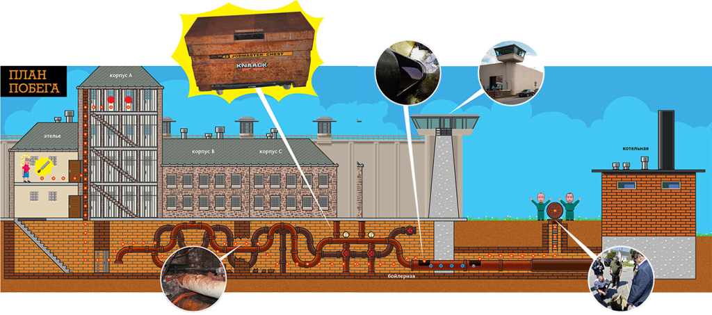 Главным двигателем всей этой истории оказался Свит. Мэтт, наверное, сдался бы еще на моменте бесконечного пиления первого отверстия, однако молодой напарник не давал Толстяку, как он называл старшего товарища, опустить руки. Сам Свит, как только пропилил дыру, в ту же ночь отправился гулять в технические тоннели. С третьего этажа, где находилась их камера, хватаясь за трубы и протискиваясь между навесными проходами, он спустился до подвального уровня. Там стояла вонючая вода, в которой плавали бычки, обрывки проводов и другой мусор, выброшенный заключенными в вентиляционные решетки их камер. К счастью, исследователю не пришлось действовать вслепую, у него с собой были очки с фонариком — художники давным-давно заказали их у надзирателей для работы по вечерам. Свит сообразил, что надо искать, куда уходят вентиляционные и канализационные трубы. Вскоре он обнаружил, что их «кошачий променад» соединен с целой системой тоннелей, ведущих под основное здание тюрьмы. Это был настоящий лабиринт, и ходить по нему можно было абсолютно беспрепятственно!