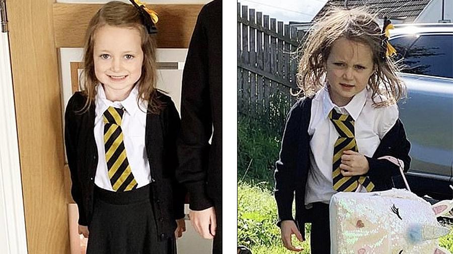 А пока на просторах интернета я нашла фото 5-летней первоклассницы из Глазго, которое выложила её мама. Слева на фото - 5-летняя первоклассница перед началом похода на свой первый учебный день в школу. Как говорится, первый раз - в 1 класс. Аккуратно выглаженная школьная форма. Белоснежная рубашка со стильным галстукам а-ля "Билайн", модная причёска, увенчанная аксессуаром для волос, всё в той же цветовой гамме Билайна. А справа - фото той же первоклашки. Но уже после окончания первого школьного дня... Похоже на то, что девочка разочарована...