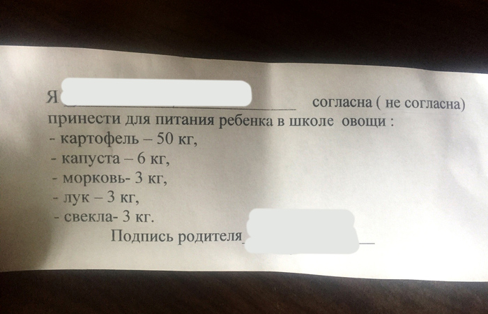 Список овощей, которые по мере возможности нужно сдать для питания детей в школьной столовой, выдали родителям в одной из школ находящейся в Брянской области. Всего-то и требуется 50 кг картофеля, 6 кило капусты и по 3 килограмма моркови, лука и свеклы. В записке выделено место для фамилии, имени, отчества родителя и его подписи.