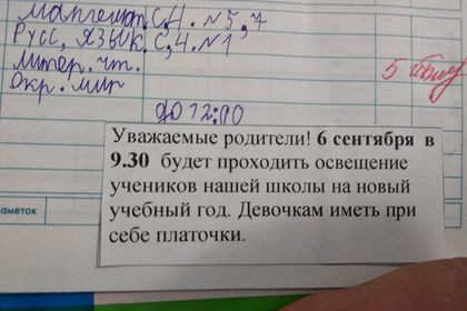 Он прикрепил фото дневника своего сына, в котором был вкладыш с объявлением: «6 сентября в 9.30 будет проходить освещение учеников на новый учебный год. Девочкам иметь при себе платочки». Слово «освящение» было написано с ошибкой.