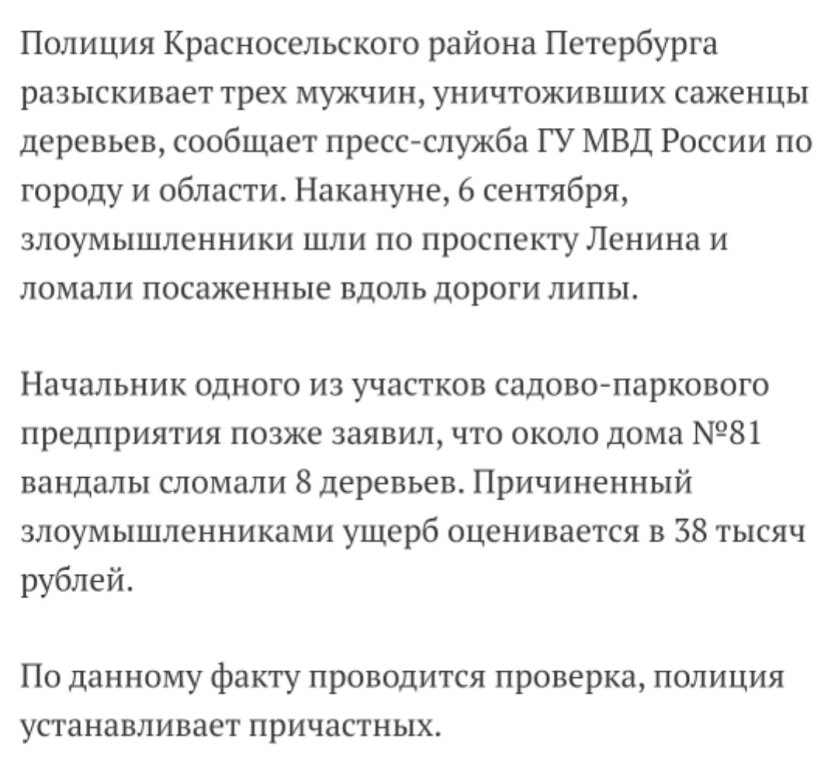 Сегодня, 7 сентября, сотрудники полиции Красносельского района Петербурга вычислили двоих молодых людей, уничтоживших несколько молодых лип, высаженных в городе около двух лет назад. Об этом сообщает пресс-служба ГУ МВД по городу и Ленобласти.