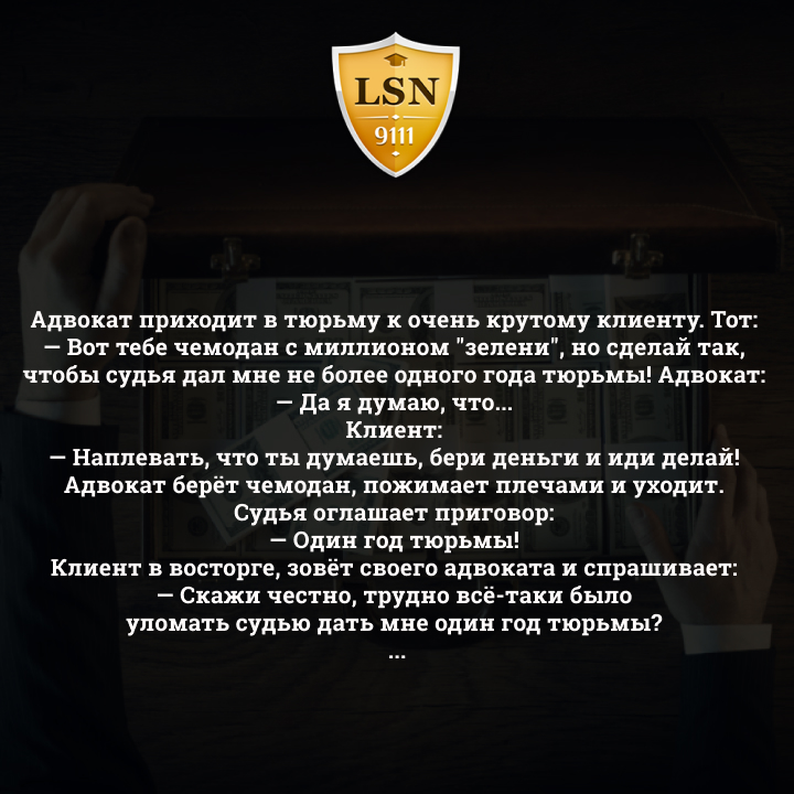 Есть очень хорошие, хоть и бородатые, анекдоты! И поучительные! Не надо затыкать рот адвоката и слушать его внимательно!