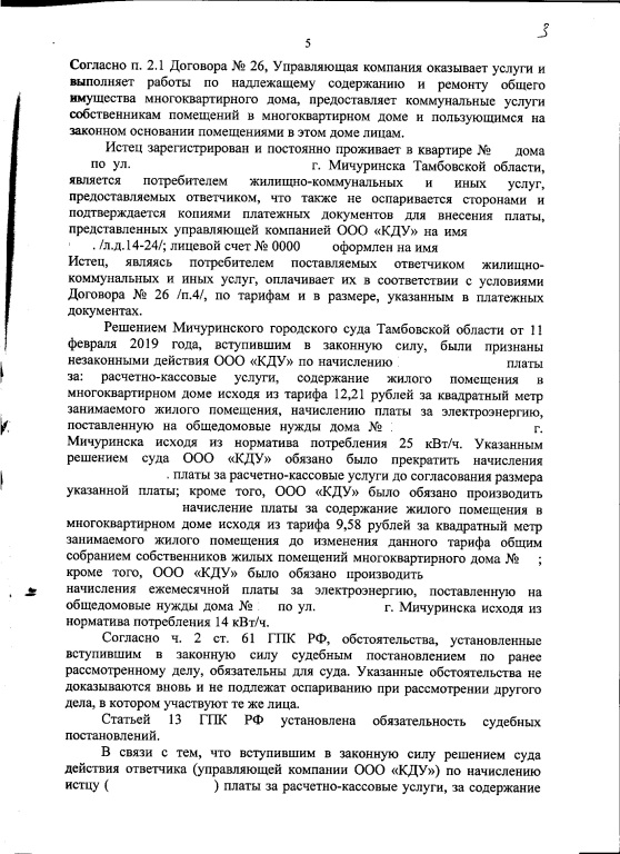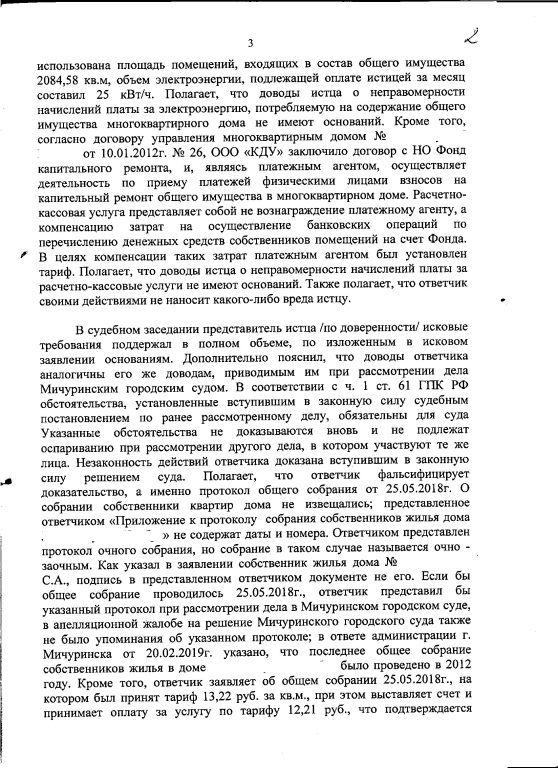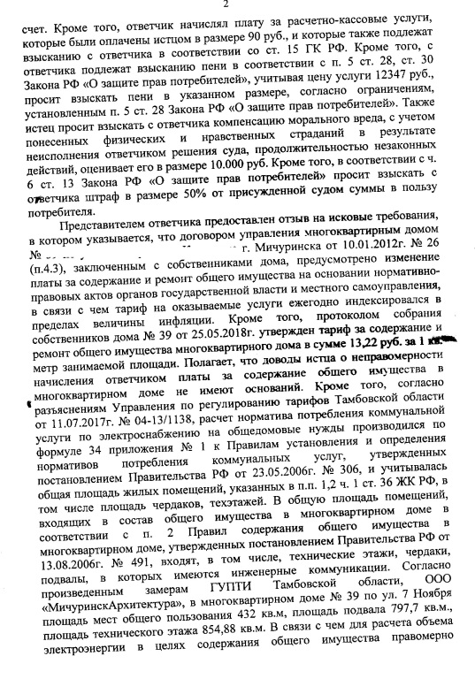 На беседе оказалось, что общее собрание в доме ответчицы приняло год назад решение о повышении тарифа. Истица ни об общем собрании, ни о повышении ни сном, ни духом. Квитанции получала по старому тарифу, признанному незаконным. Ну тут уж я развернулся! Выдержка из моих письменных пояснений:
