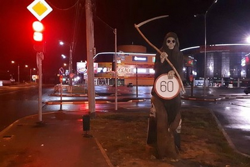 По данным издания, на Ленинградском проспекте в минувшую пятницу был установлен деревянный силуэт в черном балахоне, который держит в одной руке знак ограничения скорости (60 км/ч), а в другой — косу.